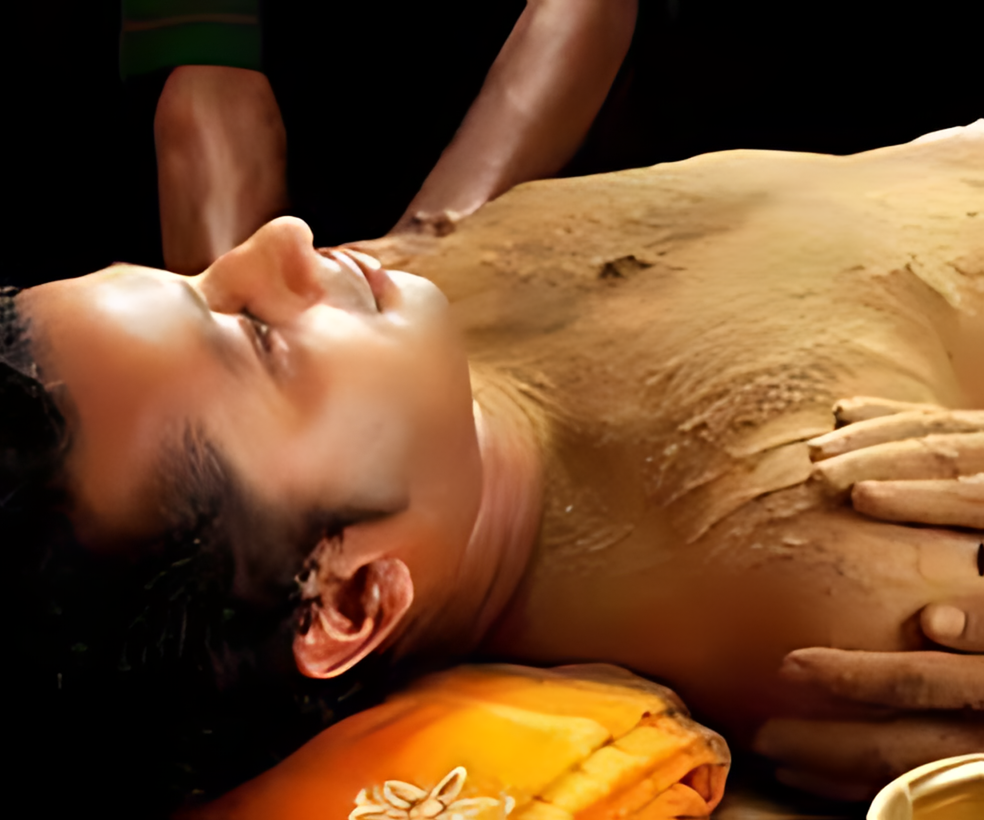 Ruksha Udvartana — Ayurvedic Powder Massage. The heated herbal powder is applied to the body with fast upward massage strokes. As this is a dry massage, herbal oil isn't applied during the treatment.